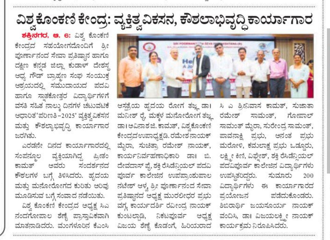 ದಿ. 31-07-2025 ಮಂಗಳೂರಿನ ಶಕ್ತಿನಗರದ ವಿಶ್ವ ಕೊಂಕಣಿ ಕೇಂದ್ರದ ಸಹಯೋಗದೊಂದಿಗೆ ಶ್ರೀ ಪೂರ್ಣಾನಂದ ಸೇವಾ ಪ್ರತಿಷ್ಠಾನ (ರಿ) ಹಾಗೂ ದಕ್ಷಿಣ ಕನ್ನಡ ಜಿಲ್ಲಾ ಕುಡಾಳ್ ದೇಶಸ್ಥ ಆಧ್ಯ ಗೌಡ್ ಬ್ರಾಹ್ಮಣ ಸಂಘ (ರಿ), ಇವರ ಸಂಯುಕ್ತ ಆಶ್ರಯದಲ್ಲಿ ಕುಡಾಳ್ ದೇಶ್ಕರ್ ಸಮುದಾಯದ ಪದವಿ ಹಾಗೂ ಸ್ನಾತಕೋತ್ತರ ವಿದ್ಯಾರ್ಥಿಗಳಿಗೆ ವಸತಿ ಸಹಿತ ನಾಲ್ಕು ದಿನಗಳ ಚಟುವಟಿಕೆ ಆಧಾರಿತ “ಪರಿಣತಿ” -2025′ ವ್ಯಕ್ತಿತ್ವ ವಿಕಸನ ಮತ್ತು ಕೌಶಲ್ಯಾಭಿವೃದ್ಧಿ ಕಾರ್ಯಾಗಾರವನ್ನು ಆಯೋಜಿಸಲಾಗಿತ್ತು.